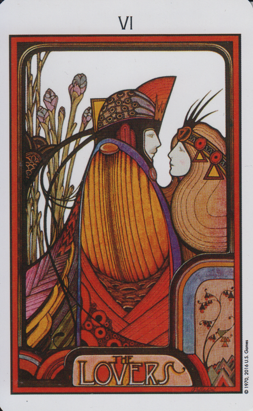 This deck was published in 1970 which you can see by the design of the illustrations. There are a lot of warm colours - reds and oranges and stylised imagery inspired by Art Deco and Art Nouveau.